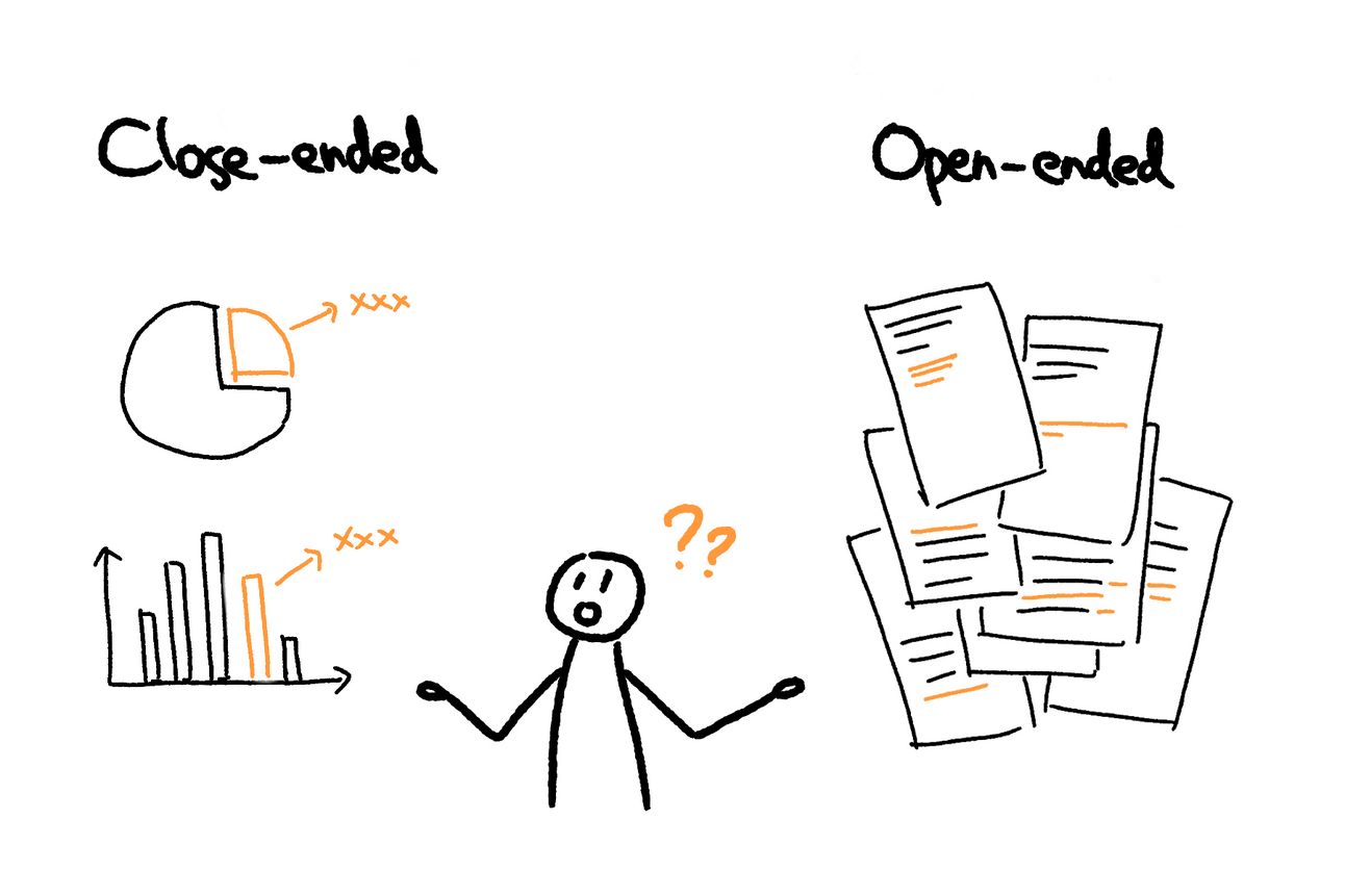 Another major issue with open-ended questions is data analysis. Even if you receive many responses, manually sorting through and interpreting open-ended answers becomes a nightmare once your sample size exceeds 100 participants—unless you have strong programming skills or a dedicated team. In contrast, closed-ended questions allow for easy data manipulation using tools like Excel, making it much simpler to generate clear, persuasive visualized insights for presentations or reports. I know you need something to persuade stakeholders, so ensure your questionnaire can provide you these cool numbers.